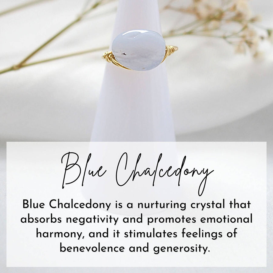 Sininen kalsedoni on hoivaava kristalli, joka imee negatiivisuutta ja edistää emotionaalista harmoniaa, ja se stimuloi hyväntahtoisuuden ja anteliaisuuden tunteita. Kalsedoni parantaa henkistä tilaasi ja se tehostaa kuuntelutaitoja ja kommunikointitaitoja. Parantaa itsetuntemusta ja parantaa muistia.